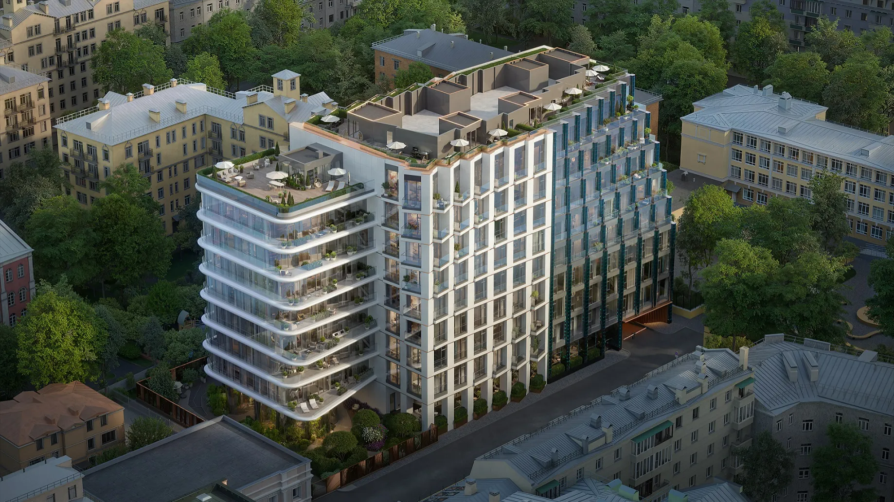 Здание с архитектурой от бюро ADM гармонично вписано в исторический облик района и при этом выглядит эффектно и современно. Каждый из фасадов — белый глянцевый с плавными консольными террасами, выступающими на 4 метра, каменный с волновой пластикой балконов и полностью стеклянный — имеет индивидуальное художественное решение.